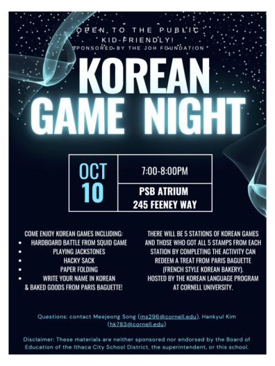 Come enjoy Korean games and baked goods from Paris Baguette. There will be 5 stations of Korean games (hardboard battle from Squid Game, playing jackstones, hacky sack, paper-folding, and writing your name in Korean) and those who got all 5 stamps from each station by completing the activity can redeem a treat from Paris Baguette (French style Korean bakery). Children-friendly!