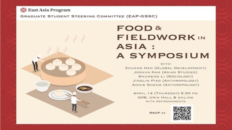 When travel is restricted during the pandemic, join EAP-GSSC’s symposium on “Food and Fieldwork” for a fulfilling journey. Emerging Cornell scholars from anthropology, sociology, development, and Asian studies will share their methodologies of fieldwork and stories of food. After a food trip to borderland Yunnan with Zhuang Han (Global Development), get a taste of Hainanese "western" food in Malaysia with Joshua Kam (Asia Studies), then indulge in the realm of bread with Annie Sheng (Anthropology); explore how organic food has been brought from farm to table with Shumeng Li (Sociology), and head to Sichuan for rituals of food with Jinglin Piao (Anthropology). HYBRID event. The in-person location is Uris Hall G08. Light refreshments will be served but rsvp is required and limited only to Cornell community members. Please rsvp for in-person participation using https://cornell.ca1.qualtrics.com/jfe/form/SV_6hy6iNesrTXeZxk
