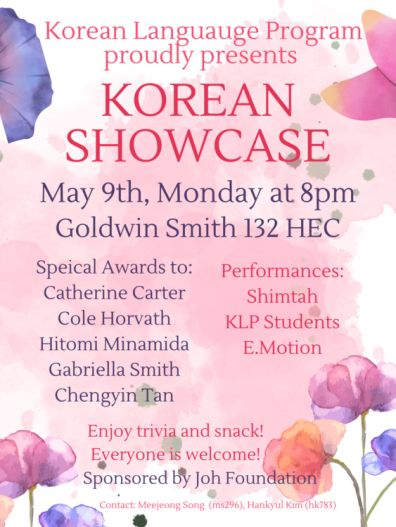 Come to our annual Showcase event and join us congratulating these 5 students who will receive Achievement Award! Shimtah and E.Motion will perform for us and students from 6 different courses will present their projects. Also, enjoy trivia and Korean snack! Invite your friends and let's celebrate the end of the semester together!