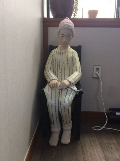 The event image is of a statue by Pak Yujin (박유진). Description: A statue of Hwang Yumi is sitting in a chair in the corner of the room below the window with daylight shining through. After working at a Samsung Electronics semiconductor plant, Hwang Yumi died of acute myeloid leukemia. She is wearing striped hospital pants, a top, a pink cap, and pink socks. She is looking down toward the floor and her two hands are on her thighs in fists. There are two potted plants on the windowsill. Next to the chair is an outlet with a single white plug and cord trailing out of the frame of the image.