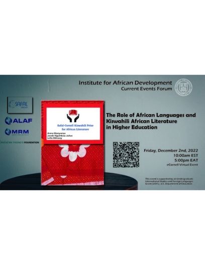This literary panel is the first formal collaboration between the Institute for African Development (IAD) and the Safal-Cornell Kiswahili Prize for African Literature. It will showcase three recent literary winners of the Safal-Cornell Kiswahili Prize for African Literature, as they speak on poetry, travel, and Kiswahili intergenerational transcendence. Participants will learn about contemporary Kiswahili African literature, the role it plays in the American higher education system, and why it is essential to encourage academic engagement in this disciplinary focus.