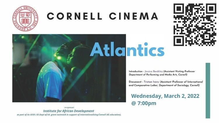 Join the Institute for African Development (IAD) at Cornell Cinema on 3/2 at 7pm for the screening of Mati Diop's Atlantics with a post-screening discussion with Tristan Ivory, Assistant Professor of International and Comparative Labor, Department of Sociology. This film is a part of the Sub-Saharan African film series presented by Cornell Cinema and sponsored by IAD and the UISFL grant.