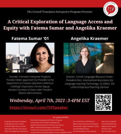 The Translator Interpreter Program (TIP) is facilitating an online discussion, “A Critical Exploration of Language Access and Equity with Fatema Sumar and Angelika Kraemer,” featuring Fatema Sumar ‘01, the founder of TIP and President Biden-appointed Vice President of the Department of Compact Operations at the Millennium Challenge Corporation, and Angelika Kraemer, the faculty advisor of TIP and Director of the Language Resource Center at Cornell. The Translator Interpreter Program is a student-run program of the Cornell University Public Service Center, providing free translation and interpretation services in a wide range of languages for the community agencies in emergency and non-emergency situations.
