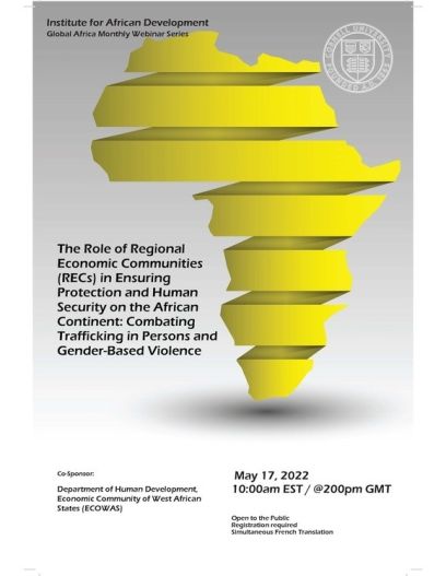 Similarly, other Regional Economic Communities (RECs) are involved in promoting the human development of their citizens and thus the proposed topic of the joint ECOWAS/Cornell-2022 Cornell IAD Global Africa Monthly Webinar Series is for ECOWAS and other RECs to share experiences in their work in ensuring protection and human security on the African continent. Particular focus will be on ECOWAS and other RECs work in combating human trafficking and gender-based violence as they are very critical to protection and human security. The focus is also premised on the growing menace and adverse impact of both issues on the vulnerability, victimization, and violation of peoples’ rights, quality of life, and in some cases, the survival of people in vulnerable situations. Unfortunately, the COVÍD-19 pandemic further worsened the protection and human security of persons on the African continent because the stringent response measures, especially the lockdown in most of 2020, undermined weak public services and systems which led to increased vulnerability of many people, especially children and women. From studies, it became clear that GBV was indeed a shadow pandemic as the incidences of abuses increased astronomically.