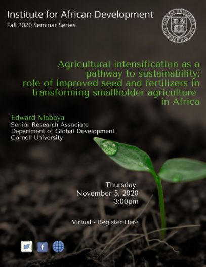 Institute for African Development Special Topic Seminar Series: Agricultural intensification as a pathway to sustainability: The role of improved seed and fertilizers in transforming smallholder agriculture in Africa
