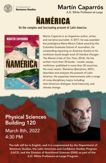 This event is part of Caparrós’s first visit as an A.D. White Professor-at-Large (ADW-PAL) to Cornell. His on-campus residency runs March 7-11, 2022. He was elected as an ADW-PAL in 2019. His appointment runs through 2025.