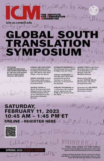 The Institute for Comparative Modernities' second Global South Translation Symposium, featuring presentations by the 2022-2023 cohort of translators (see below). Moderated by ICM member Natalie Melas, with remarks by Jan Steyn (Translation Studies, University of Iowa) and others.