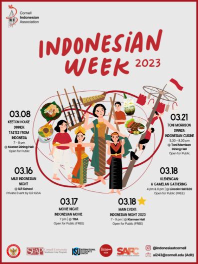 Indonesian Night 2023 is the biggest annual event of the Cornell Indonesian Association. The purpose of Indonesian Week 2023 is to promote the richness of Indonesian culture and arts to Cornell, creating awareness among guests of the beauty and variety of Indonesia to the whole Cornell University community. The event will feature Indonesian traditional music, Indonesian movies, an experience booth, and real Indonesian food. Authentic Indonesian cuisine will be provided, while traditional and modern Indonesian dance and music acts will excite the audience.