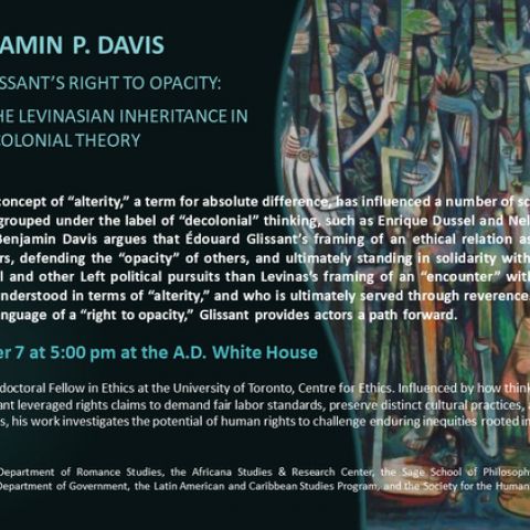 Summary: Emmanuel Levinas’s concept of ‘alterity’, a term for absolute difference, has influenced a number of scholars who have recently come to be grouped under the label of ‘decolonial’ thinking, such as Enrique Dussel and Nelson Maldonado-Torres. In this talk, I argue that Édouard Glissant’s framing of an…