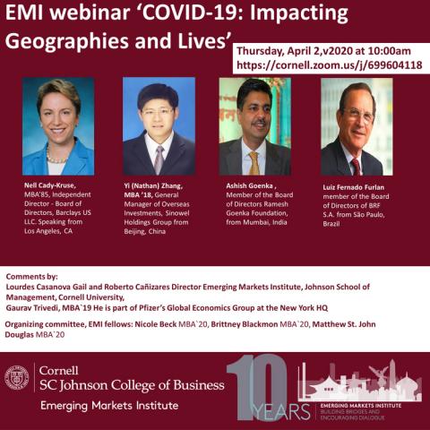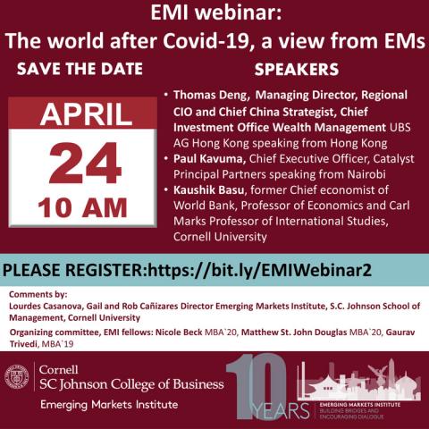 The Emerging Markets Institute (EMI) invites you to a webinar ‘COVID-19: Impacting Geographies and Lives’ on Thursday, April 2 at 10 a.m. Zoom connection: https://cornell.zoom.us/j/699604118. Please, save the date and link!