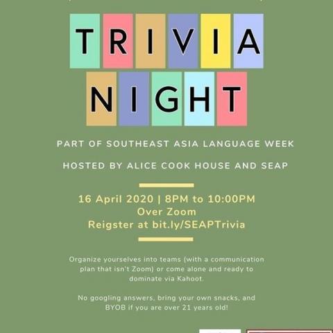 The Southeast Asia Program (SEAP) would like to invite you to Trivia Night, hosted over Zoom by Alice Cook House on Thursday April 16, 8pm-10pm. We will be celebrating the languages and cultures of Southeast Asia as a part of Southeast Asia Language Week!