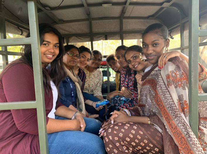 Kamala Eyango MPS ’20 smiles with a group of people in India, seated in the back of an open car.