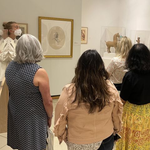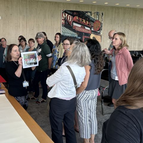 A museum staff person shows a work of art to a group of standing teachers.