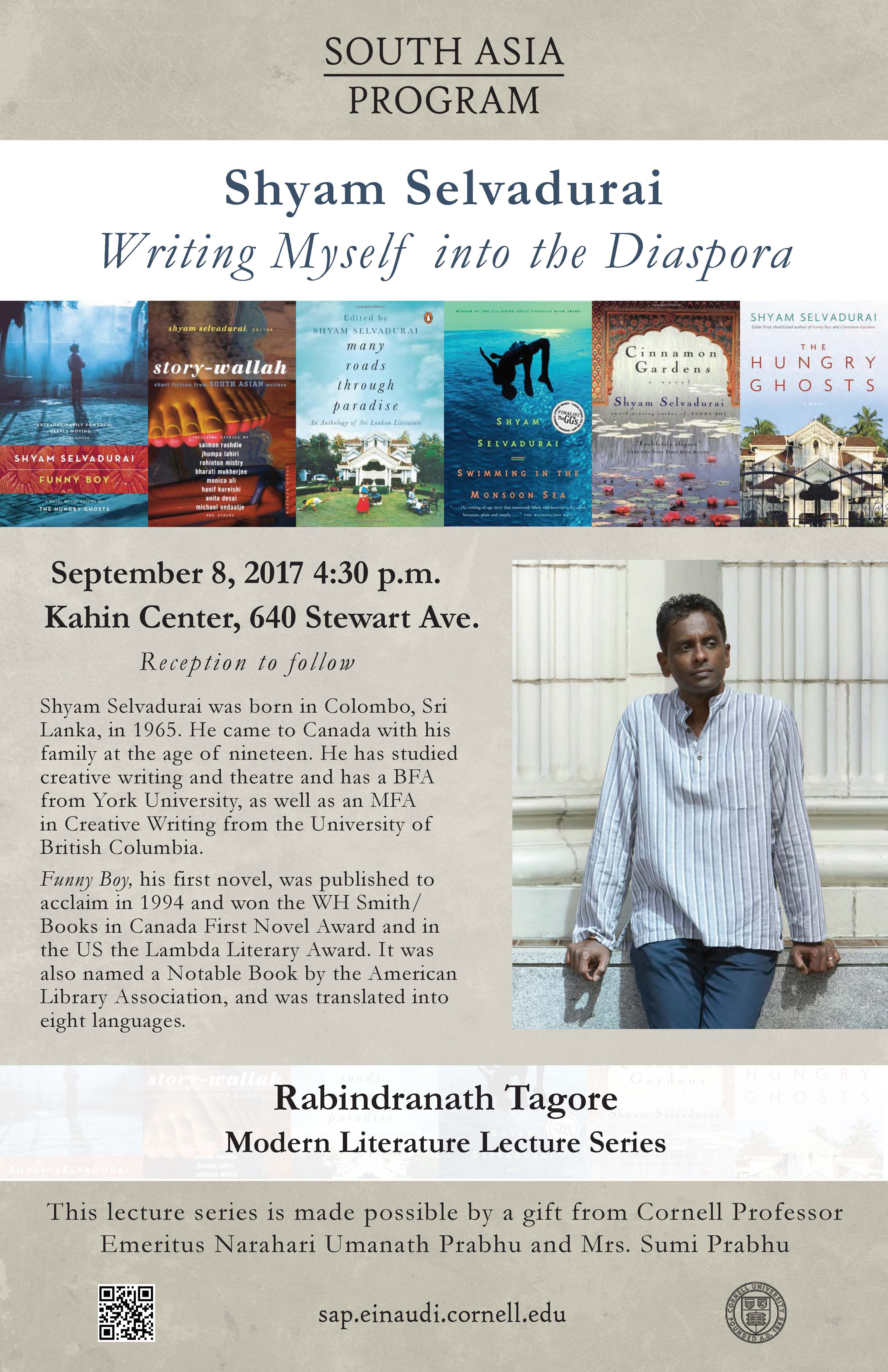 On September 8, 2017, Sri Lankan-Canadian author, Shyam Selvadurai spoke on "Writing Myself into the Diaspora." He read from his novel The Hungry Ghosts and talked about what it means to be a writer working from the hyphen between Sri Lankan and Canadian. Selvadurai was born in Colombo, Sri Lanka, in 1965. He came to Canada with his family at the age of 19. He has studied creative writing and theater and has a BFA from York University, as well as an MFA in Creative Writing from the University of British Columbia.