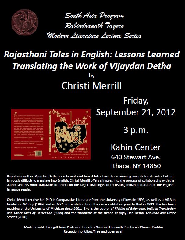 On September 21, 2012, Christi Merrill spoke on "Rajasthani Tales in English: Lessons Learned Translating the Work of Vijaydan Detha." Rajasthani author Vijaydan Detha's exuberant oral‐based tales have been winning awards for decades but are famously difficult to translate into English. Merrill offers glimpses into the process of collaborating with the author and his Hindi translator to reflect on the larger challenges of recreating Indian literature for the English language reader.