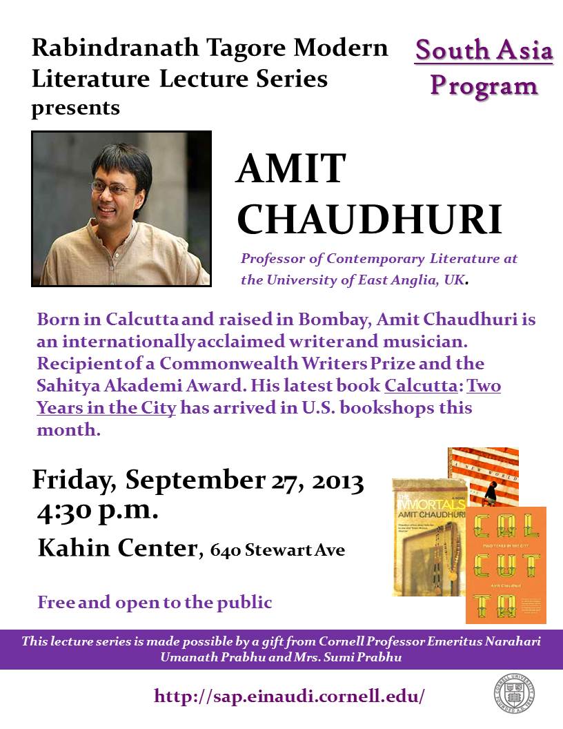 On September 27, 2013, novelist Amit Chaudhuri presented that year’s Rabindranath Tagore Modern Literature. Born in Mumbai in 1962, Chaudhuri grew up in Bombay. He has written numerous novels, short stories, poems, and critical essays in English. He is currently Professor of Contemporary Literature at the University of East Anglia. Chaudhuri is the author of five novels, the latest of which is The Immortals, a novel about music in the modern world.