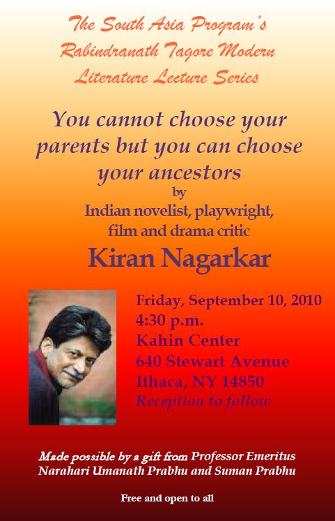 On September 10, 2010, Indian novelist, playwright, film and drama critic Kiran Nagarkar delivered the Tagore Lecture, "You Cannot Choose Your Parents but You Can Choose Your Ancestors."