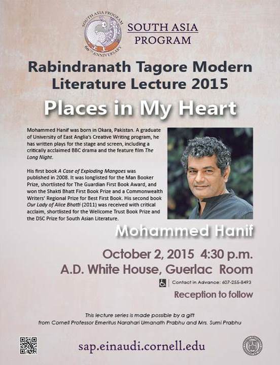 On October 2, 2015, Pakistani writer and journalist Mohammed Hanif delivered "Places in My Heart," the 2015 Tagore Lecture in Modern Indian Literature. A graduate of University of East Anglia's Creative Writing program, he has written plays for the stage and screen, including a critically acclaimed BBC drama and the feature film, The Long Night. His first book, A Case of Exploding Mangoes, was published in 2008.