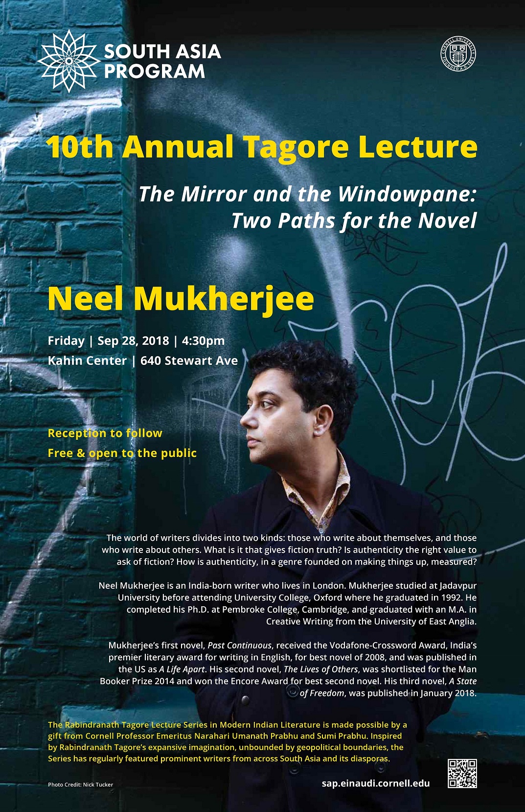 On September 28, 2018, Neel Mukherjee, an Indian-born writer who lives in London, delivered the 10th annual Rabindrinath Tagore Lecture in Modern Indian Literature on "The Mirror and the Windowpane: Two Paths for the Novel. "The world of writers divides into two kinds: those who write about themselves and those who write about others. What is it that gives fiction truth? Is authenticity the right value to ask of fiction? How is authenticity, in a genre founded on making things up, measured?