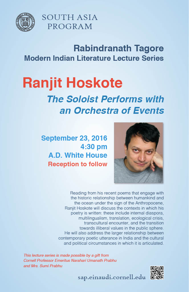 On September 23, 2016, Hoskote addressed the tension between contemporary poetry and current cultural and political debates over India’s national identity in a globalized world. He also discussed some of the contexts in which he writes his own poetry, including diaspora, multilingualism, translation, ecological crisis, transcultural encounters, and the rise of illiberal demagoguery.