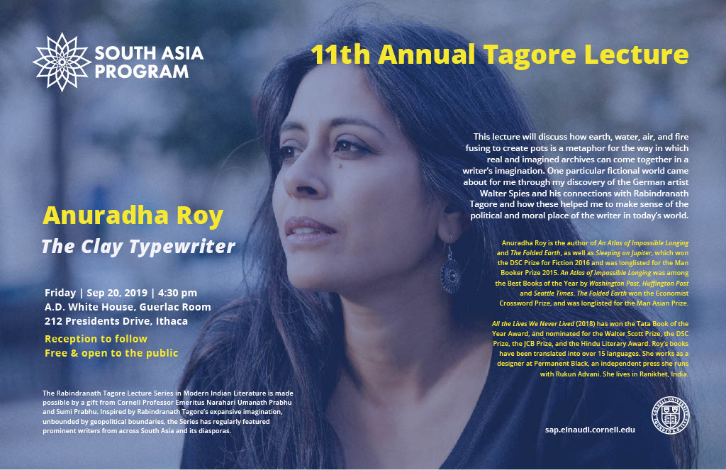 On September 20, 2019, Indian author Anuradha Roy delivered the 11th annual Rabindrinath Tagore Lecture in Modern Indian Literature on "The Clay Typewriter." This lecture discussed how mud and words are connected in her work; how earth, water, air, and fire fusing to create pots is a metaphor for the way in which real and imagined archives can come together in a writer’s imagination and result in fictional worlds. She expands on this metaphor by talking about how one particular fictional world came about for her through her discovery of the German artist Walter Spies. His connection with Rabindranath Tagore was just one example of how historical figures entered her book and helped her to make sense of the political and moral place of the writer in today’s world.
