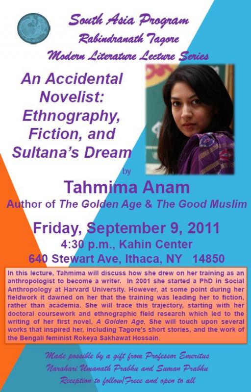 On September 9, 2011, Tahmima Anam, author of The Golden Age and The Good Muslim, delivered "An Accidental Novelist: Ethnography, Fiction, and Sultana's Dream." In this lecture, Anam discussed how she drew on her training as an anthropologist to become a writer. In 2001 she started a PhD in social anthropology at Harvard University. However, at some point during her fieldwork it dawned on her that the training was leading her to fiction, rather than academia. She traced this trajectory, starting with her doctoral coursework and ethnographic field research which led to the writing of her first novel, A Golden Age. She touched upon several works that inspired her, including Tagore’s short stories, and the work of the Bengali feminist Rokeya Sakhawat Hossain.