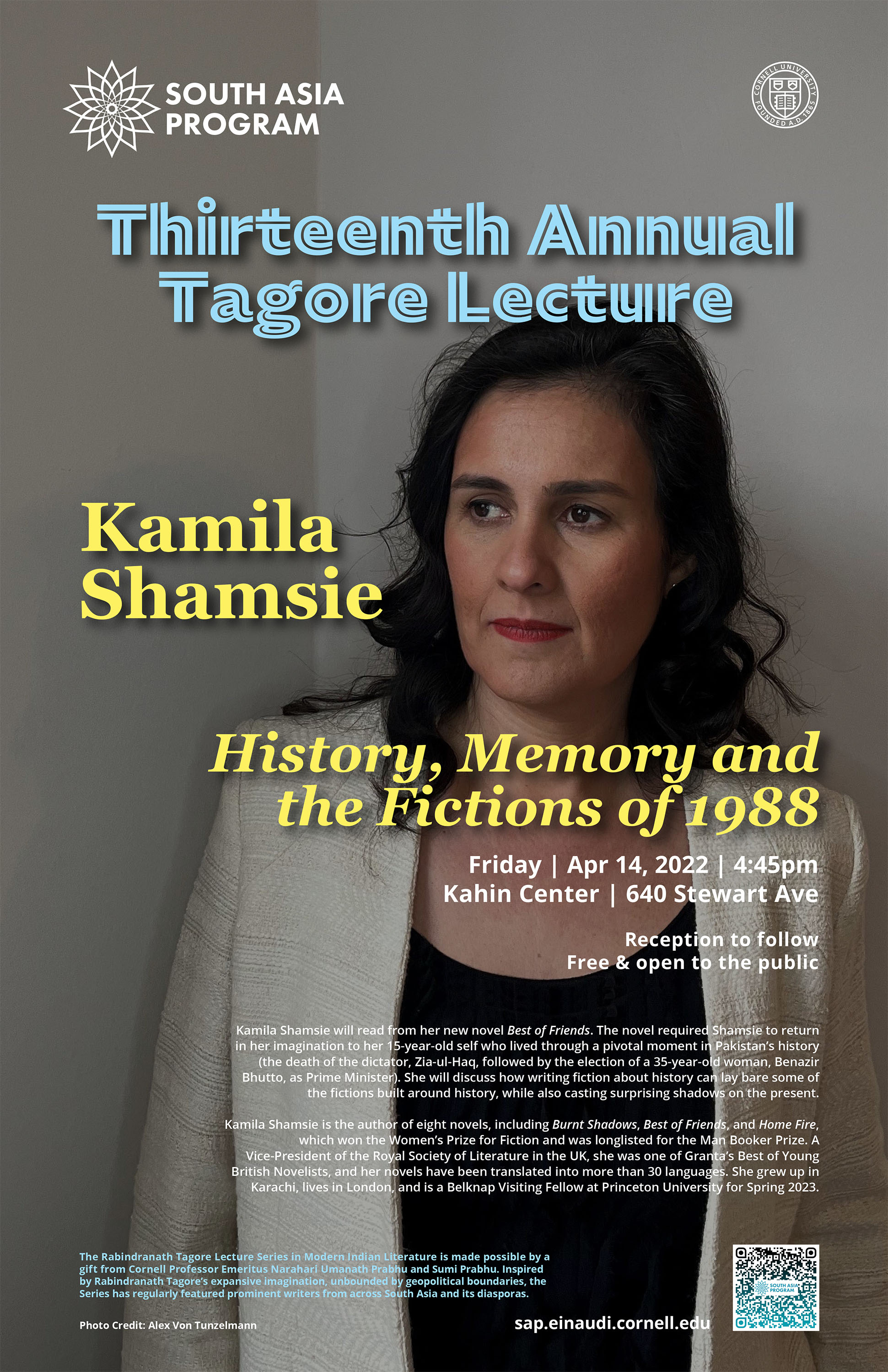 On April 14, 2023, Pakistani-British novelist Kamila Shamsie presented "History, Memory and the Fictions of 1988," including a reading from her latest novel, Best of Friends. The novel required Shamsie to return in her imagination to her 15-year-old self who lived through a pivotal moment in Pakistan’s history (the death of the dictator, Zia-ul-Haq, followed by the election of a 35-year-old woman, Benazir Bhutto, as Prime Minister, in 1988). She discussed how writing fiction about history can lay bare some of the fictions built around history, while also casting surprising shadows on the present.