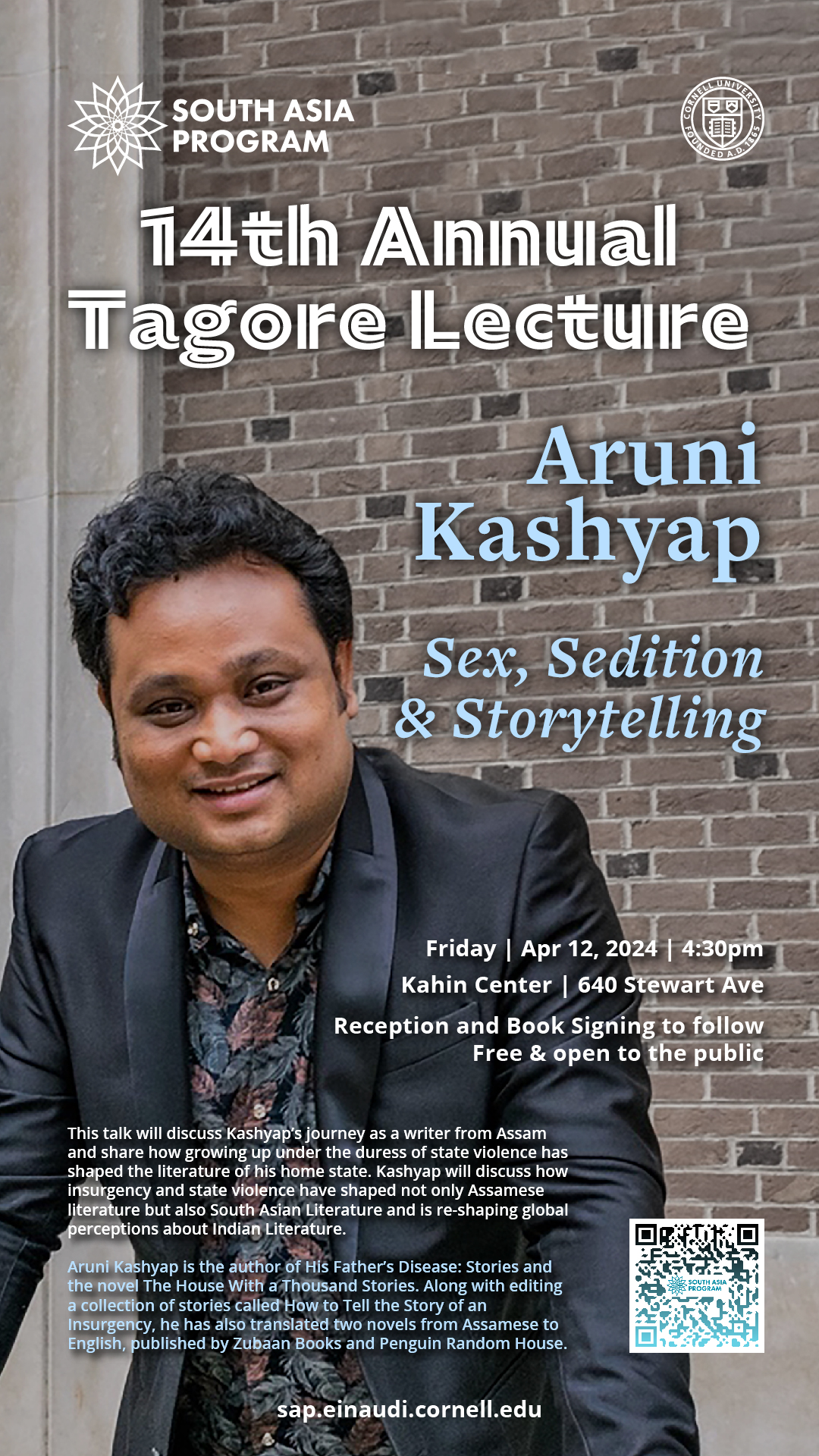 On April 12, 2024, novelist, essayist, poet and translator Aruni Kashyap presented the 14th Annual Tagore Lecture, "Sex, Sedition, and Storytelling." In this talk, Kashyap discussed his journey as a writer from Assam and shared how growing up under the duress of state violence has shaped the literature of his home state. Kashyap also analyzed how insurgency and state violence have shaped not only Assamese literature but also South Asian Literature and is re-shaping global perceptions about Indian Literature.